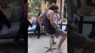 Muž si robí srandu zo svojich priateľov, pomocou upravenej stolice.