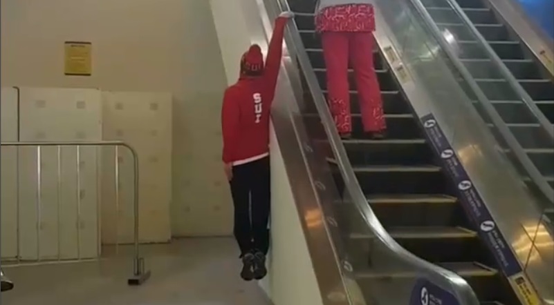 Швајцарски спортиста слободног скијања, Фабијан Боесцх, То нам показује како да се попнем покретним степеницама споља.