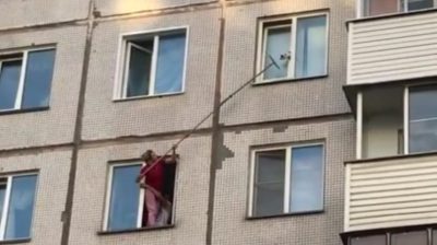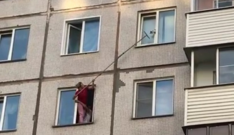 У граду Новосибирск, жена користи импровизованој Скуеегеес далеко да спаси маче. Маче је углављен у прозору одељку, на 6. спрату стамбене зграде.