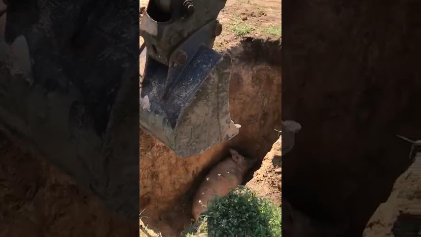 Багер оператер у Русији спасава свињу која је пала у дубоку рупу.