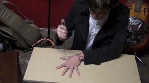 На популарном тржишту у Кини, продавац ножева показује колико су му ножеви оштри тако што сече комад меса....