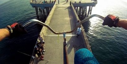 Ово је Рицхие Тримбле на његовом импровизованом џиновском бициклу под називом 'СтоопидТалл', који има висину од 4,42 метара. Ovde glavni po prvi put na ulicama Los Angelesa.