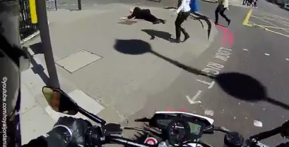 Motociklista koji je kraljevski jordanski vidi jedan stariji pada na trotoar i prestaje odmah da mu pomogne.