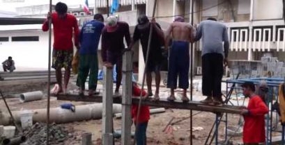 Skupina građevinskih radnika na Tajlandu koristite Ritmički težina potopiti jednu drvenu.