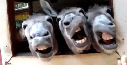 Četiri magarci napraviti zabavan grimasa čeka sa čežnju delikates.