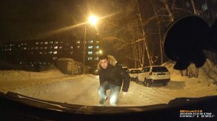 Čudno reakcija na peљaka u Novosibirsku, Rusija. Prelazi ulicu bez gledanja i uznemiren sa upravljačkim programom koji ga je skoro udario. Onda izvadi svoju cipelu, баца га на [...]