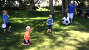 Otac godine da igraju fudbal kad su deca koristeći ogromna lopta.