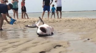 Bela ajkula isplivao na plažu, kada je pokušao da uhvatim galebovi, u Chatham, grad na poluostrvu Cape Cod, Massachusetts. Рибу су првобитно спасили учесници који су је одржали у животу бацивши је [...]