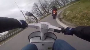 Čovek se vozi svoju Vespu smirenost u mali seoski put, Kad odjednom se prevesti brz motor. Će pokušati da ubrza i da ti uzvratim, такође прави спектакуларан прскање…