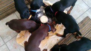 7 штенаца добермана ужива у храни, dok se vrti circularly oko posude sa na.