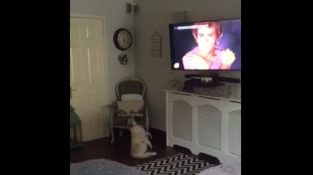Mini Wynne Buldog ogrebala zadnjice na podu dnevne sobe, остављајући утисак да плеше у ритму Вхамове песме 'Ваке Ме Уп Бефоре Иоу Го-Го' која свира на ТВ-у.