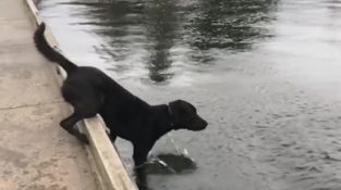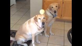 Два лабрадора покушавају да ухвате лопту и не успевају.