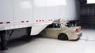 Овде је поглед на оно што се дешава када аутомобил удари тракторску приколицу са бочним стражарима, који се сада препоручује Инсуранце Институте фор Хигхваи Сафети да помогне у спречавању аутомобилских судара смртних случајева.