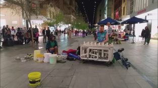 Два пријатно уметника (Цеви Гај и Тецхно Хобо) Аделаиде, Аустралија, Дете репродукције музике са импровизованим музичким инструментима.