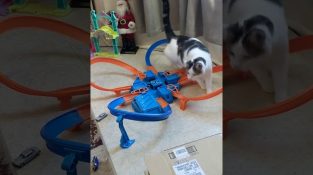 Мачка сматра да је тешко пратити велику брзину мало Хот Вхеелс кола.