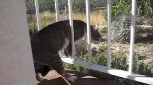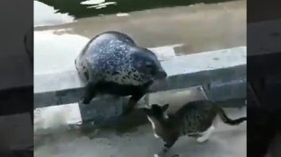 Мачка је узнемирен присуству печата и удари ногу. Печат пада на земљу као да је нокаут.