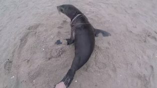 На плажи у Намибији, човек ће ухватити печат, како би се уклониле линију која је постала уплетена у врат.