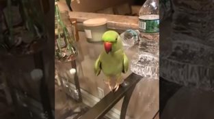 Папагај Сифи показује своју радост боунце, када бацање две флаше воде на столу.