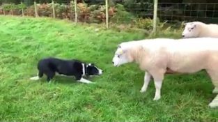 Овчар води два мишића Белтек оваца расе у свом прилогу, уз помоћ власника.