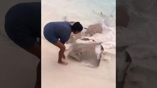 На плажи острва Малдиви Реетхи, жена исхрану велике Стинграис. Зраци се приближавају паса као пита деликатес.