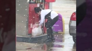 На бензинској пумпи, возач покушава да продавнице бензина у пртљажнику помоћу обичне пластичну кесу.