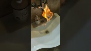 У селу Стајићево, Србија, човек нам показује како се вода из славине може упалити упаљачем. Извор воде помешан је са изворима гаса, посебно метана, i na [...]