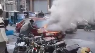 Док пролазници покушавају да угасе пламен у запаљеном аутомобилу, човек нападне ватру столицом.