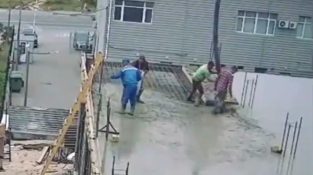 Радници сипају цемент на кров зграде, али ће конструкција пасти под теретом.