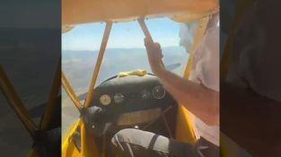 Конопом везан за ремен панталона, човек излази из кокпита Пипер Цуб-а да би поново покренуо пропелер у лету.