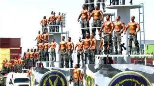 Током војне параде у Египту, војници парадирају полуголи и савијајући мишиће, док стоји усправно на возилима.