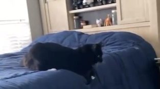 Док се мачке туку на кревету, једна од њих ће спектакуларно скочити на свог противника.