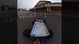 Мушкарац у Сједињеним Државама користи мали ауто на даљинско управљање, да купи храну за своју рибу из продавнице. Смешни мали аутомобил има мала колица са преклопним поклопцем позади, [...]