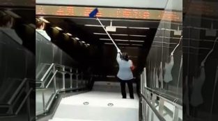 Чистачица на железничкој станици мисли да чисти светлећи знак са померајућим текстом, држећи метлу чврсто на њој.