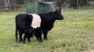 У пољу близу Тургуне, Аустралија, крава Галловаи стоји иза свог телета и камуфлира га. Галовеј краве карактеристичне црне боје са широком белом пругом у нивоу стомака.