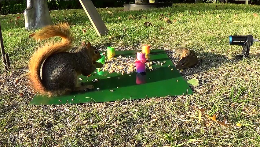 På en liten plattform med mat, en ekorre som försöker förvisa en minsta ekorre (eytamia), men den senare insisterar på att komma för lite mat. Ekorren då jag greppa en plast våren, siktar ekorren.