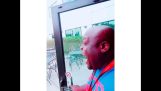 'Att köra hem från jobbet, Jag såg denna hjort få yster med min grannes gräsmatta ornament. Tvungen att sluta, säkerhetskopiera och filma en video. Jag har många kompisar som jagar hjort och behövde göra narr av dem.”