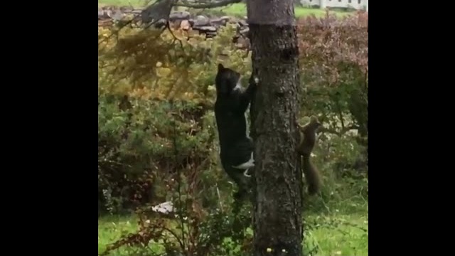 En ekorre lyckas lura en katt, som jagar honom på ett träd.