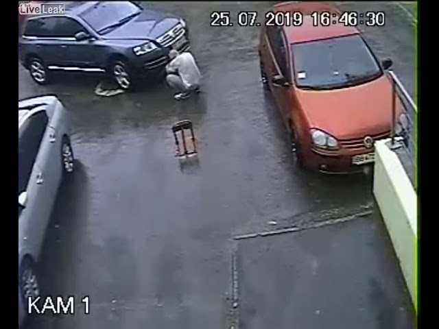 En fotgängare på en trottoar har kul skrapa dörrarna till parkerade bilar