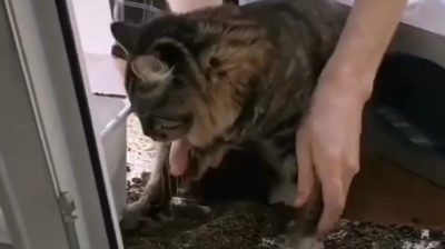 En katt tömde ett fönster låda med blommor, och sålunda sätter smutsen tillbaka på plats.