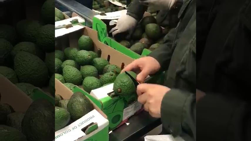 Narkotika polisen i Santa Marta, Colombia, identifierad kokain inom en handelsvara Avocado.
