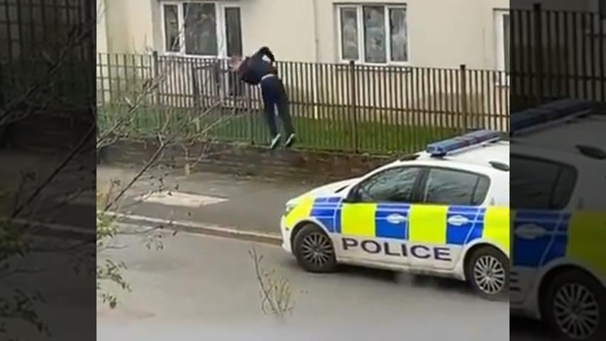 I England, en misstänkt flyr från ett fönster i sin lägenhet innan han arresteras av polisen.