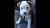 En valp flyttar en liten pall för att göra det lättare för en mormor att sitta.