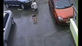 En rickshaw krockar med en parkerad bil