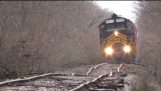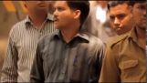En anställd på ett indiskt tåg kastar papperskorgen ur tåget när det reser.