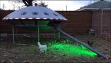 En höna och en hund spelar jag i trädgårdens trädgård.
