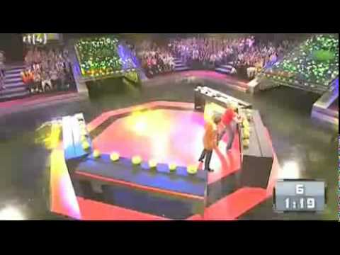 I en holländsk show, en kille som försöker bryta rekordet för mest trasiga vattenmeloner med huvudet.