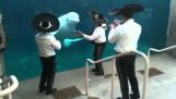 En val spelar med en besökare på Orlando SeaWorld Aquarium.