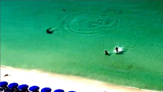En stor haj hammarhaj som närmar sig farligt två man som bada i beach Destin i Florida. Hajen har kommit ut mycket grunt när den jagar en skridsko.
