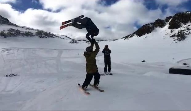 Den rutinerade freestyleåkaren Johan Berg från Norge gör ett imponerande jippo och high-fives med sin vän Alexander Ardal.