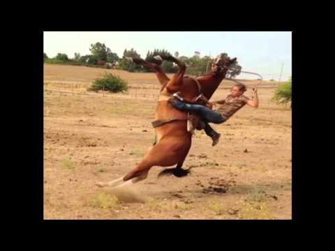 En ung kvinna sitter på en häst och uppmanar hästen fram, hästen gör konstiga ljud och vänder på ryggen, kvinna och häst faller.